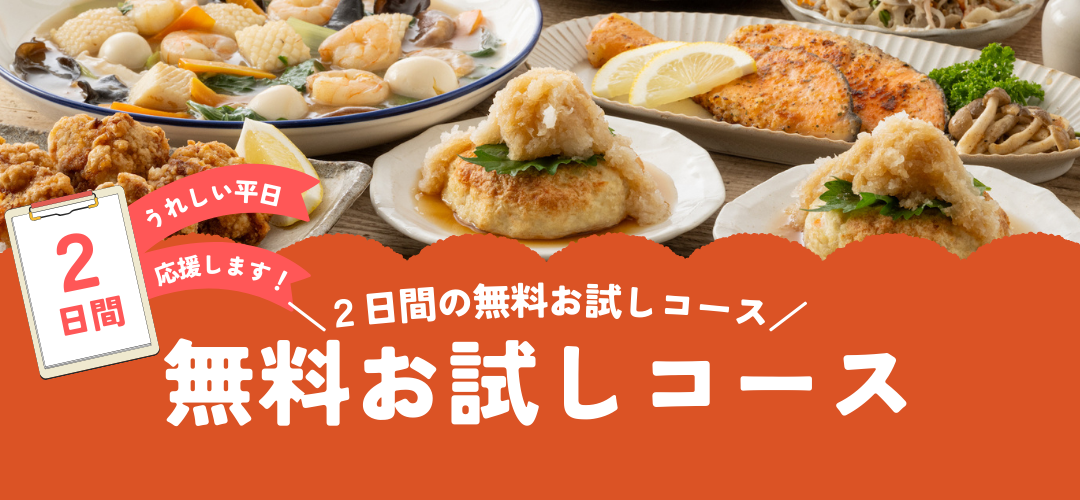 2日間のお試しコースはどこからできますか? こちらのフォームよりお申込みいただけます 会員登録なしでも注文できますか? 2日間のお試し無料コースは会員登録なしでもご利用いただけます。正式なお申込みは、会員登録後になります。 お届け場所や時間の指定はできますか? お届け先は、ご自宅、またはお勤め先へのお届けとなります。お届け時間は配達の順番によるため、ご指定や変更はできません。 不在時の対応は? 無料※の宅配ボックスを設置しております。お届けする箱の中に専用の保冷剤を使用しているため、安心です。 ※お試し2日間コースでは貸出無料ですが、本登録後は宅配ボックスの預かり金として1万円お預かりしております。こちらは退会時に返還されます。 日持ちはどのくらい? 製造から冷蔵保管で、36時間以内にお召し上がりください。(製造時間はお届け日の正午12時を起点とします。) 夏場(6~10月)は24時間以内です。 直前に温めてお召し上がりください。 配達地域を教えてください。 ご提供エリアは福井県内<福井市、坂井市(春江町・丸岡町・坂井町)、鯖江市、永平寺町(吉田郡松岡町)>です。 坂井市三国町、あわら市、金津町、越前市、奥越エリア、嶺南エリアは対象外エリアとなります。 何が届くか事前にわかりますか? 2日間の無料お試しコースはメニューが決まっています。 ご飯や汁物はついてきますか? 主菜と副菜のみ販売しておりますので、ご飯や汁物はつきません。大変恐れ入りますが、お客様自身でご用意ください。 温め方法について教えてください。 弊社では、真空袋のまま湯煎での温めをおすすめしています。電子レンジよりも均一に温めることができ、硬くならずにお召し上がりいただけます。 電子レンジをご利用する場合は必ず、お皿に移し替えてからご利用ください。